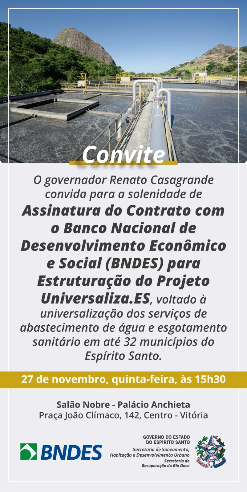 A Microrregião de Águas e Esgoto do Espírito Santo (MRAE/ES) informa a sociedade capixaba desse momento histórico para o desenvolvimento do saneamento básico no Estado. No dia 27 de novembro de 2025, às 15h30, será realizada a solenidade de assinatura do contrato entre o Governo do Estado e o Banco Nacional de Desenvolvimento Econômico e Social (BNDES), que dará início à estruturação do Projeto Universaliza.ES.